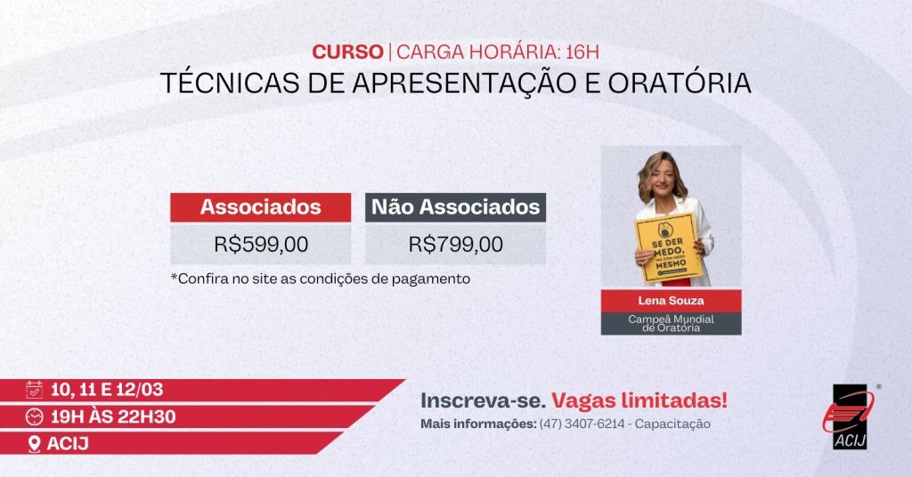 Com uma abordagem prática e dinâmica, o curso será conduzido por Lena Souza, Campeã Mundial de Oratória, que compartilhará técnicas eficazes para vencer o medo de falar em público, organizar ideias, melhorar a expressão verbal e corporal, além de engajar e convencer diferentes públicos.
